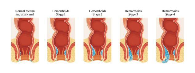 第四級 – 無法推回肛門的脫垂 肛門附近痕癢及有黏液滲出 由外痔瘡內的血栓引起的痛楚